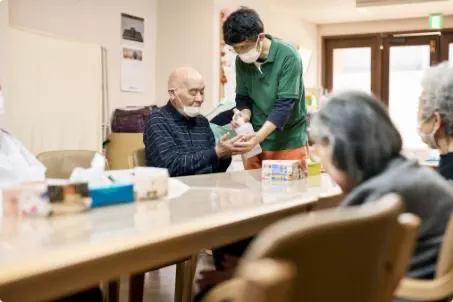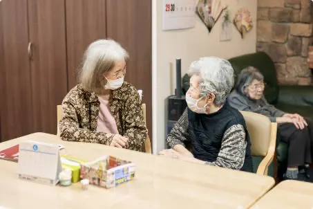 穏やかでアットホームな雰囲気のなか、安心して楽しく過ごせる場所を目指して日々施設づくりに努めています。例えば、ご利用者様とのコミュニケーションを大切にし、心ゆくまでお話を楽しんでもらう。スタッフ一人ひとりがゆっくりと穏やかな動きを取り、落ち着いた雰囲気をつくる。一つひとつは小さな心がけかもしれませんが、安心感や居心地の良さは、こういったところから生まれると考えています。